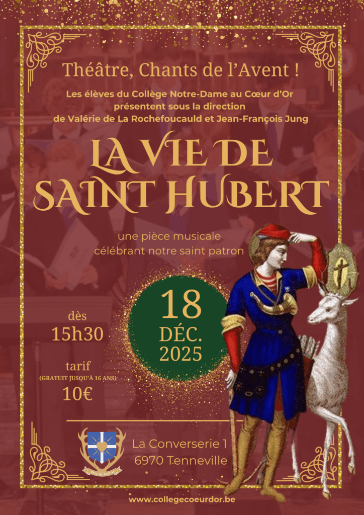Plongez dans la vie de Saint Hubert ! Les élèves du Collège Notre-Dame au Cœur d’Or vous invitent à une pièce musicale unique mêlant théâtre et chants de l’Avent. Bar et petite restauration Divers stands dont la brocante de Noël du Coeur d’Or 18 décembre 2025 – dès 15h30 à La Converserie, Tenneville. 10€ (gratuit […]