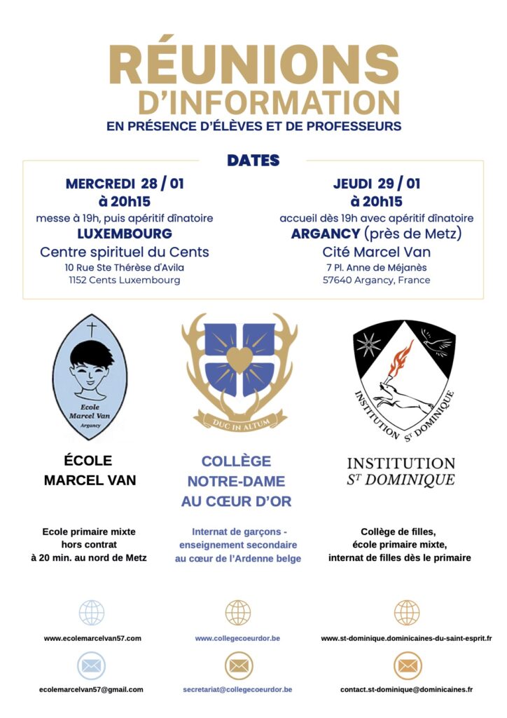 | MERCREDI 28 / 01, à 20h15 messe à 19h, puis apéritif dînatoire LUXEMBOURG Centre spirituel du Cents 10 Rue Ste Thérèse d’Avila 1152 Cents Luxembourg |